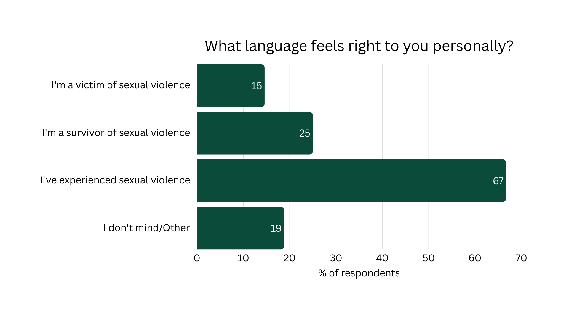 When I speak or write about my experiences with sexual trauma, I refer to myself as a survivor. But this language doesn’t feel right to everyone. Two-thirds of respondents think of themselves as “people who’ve experienced sexual violence”, rather than either victims or survivors.